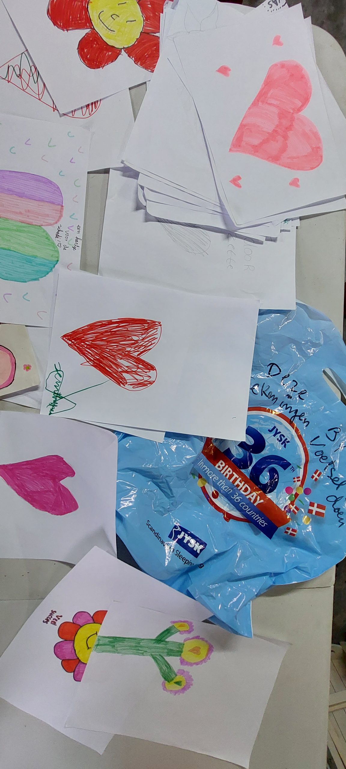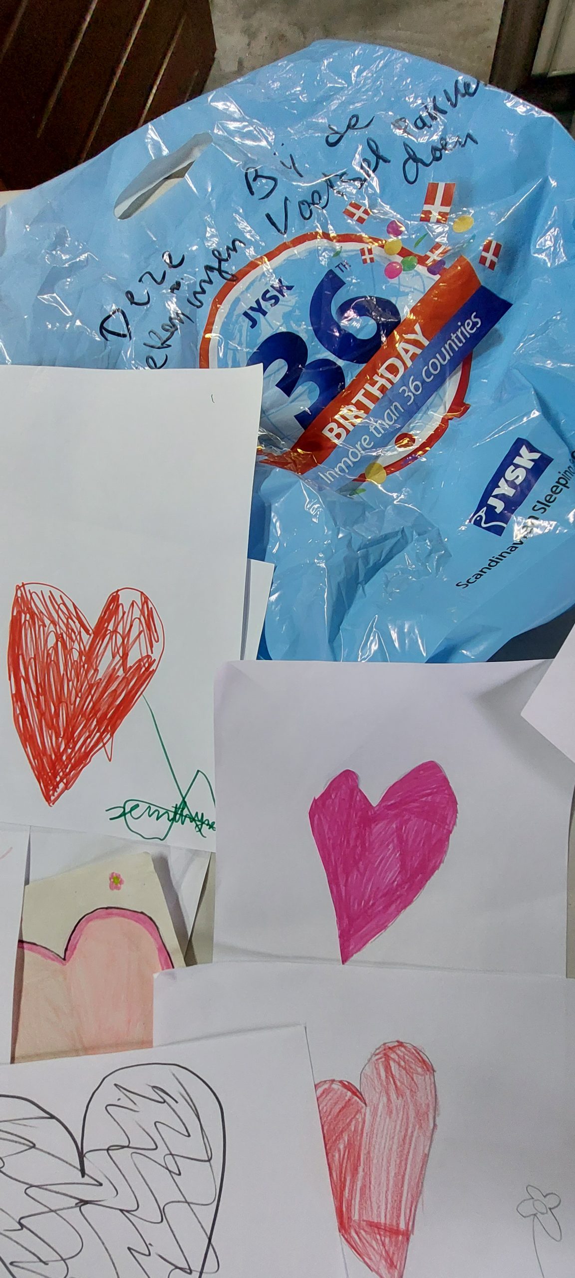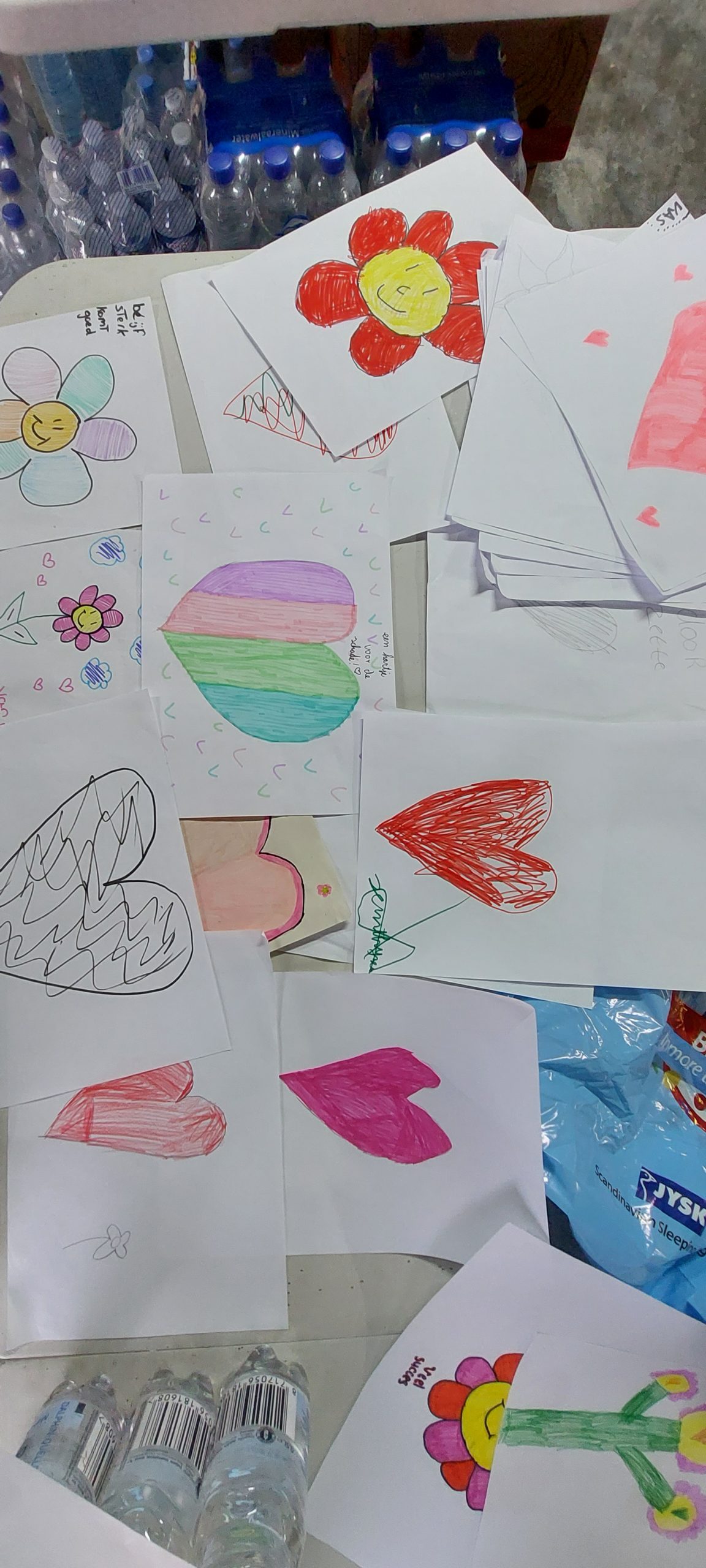 Uiteindelijk vanavond laat weer alles klaargezet voor morgen en dan tref je opeens een zak met tekeningen aan. Dan smelt je! Deze tekeningen komen van kinderen van een basisschool uit Geleen en worden morgen weer in de pakketten gestopt! Wat een topdag met al die toppers!