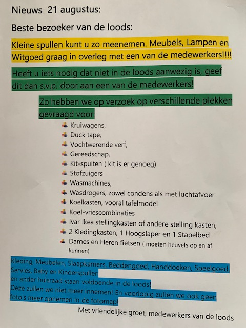 Week 6 na de watersnood is ingegaan. Leven lijkt weer zijn normale gang te gaan. Ook in Valkenburg en omgeving. Maar niet achter de hekken, daar wordt nog flink gewerkt. In de loods in Berg melden zich nog dagelijks mensen, slachtoffers. Uit Valkenburg, Nyswiller, Tussen de Bruggen en Westrand in Meerssen. De huizen staan te drogen, er wordt nog steeds (tijdelijk) meubilair, witgoed, huisraad, etc. gevraagd. De vraag naar poetsspullen begint plaats te maken voor, gereedschap, verf, schilderspullen, kit, kitspuiten enz. Vrijwilligers met busjes, aanhangers halen en brengen de gevraagde spullen. Voor deze slachtoffers gaat het leven nog lang niet zijn gewone gang; ook niet voor de vrijwilligers van de ‘Bergse Kracht’, van de ‘Kloosterkerk’, van de VOG, van de app groep van Coline en van zoveel meer.….