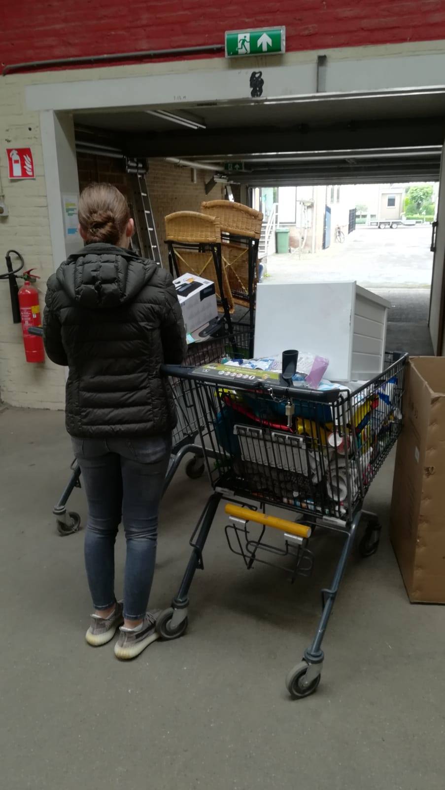 Intussen ging het werk in de loods gewoon door. De hele dag blijven mensen komen om spullen op te halen ter vervanging van de zaken die met de waterstroom zijn verloren gegaan; mensen gaan blij de poort uit en dát maakt de vrijwilligers minstens zo blij. Overigens: er blijft een grote behoefte aan witgoed!!